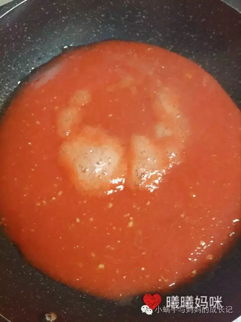 第5步:将腌渍好的番茄汁倒锅内烧开后转小火慢慢熬,要不停翻炒避免粘锅。