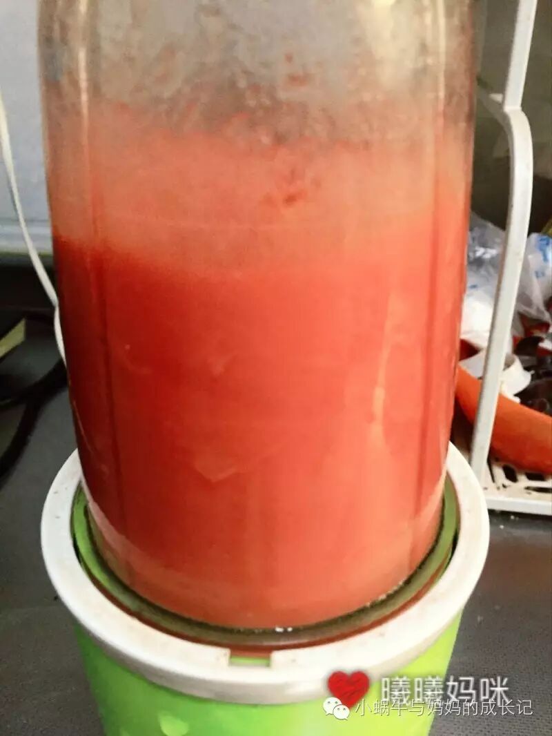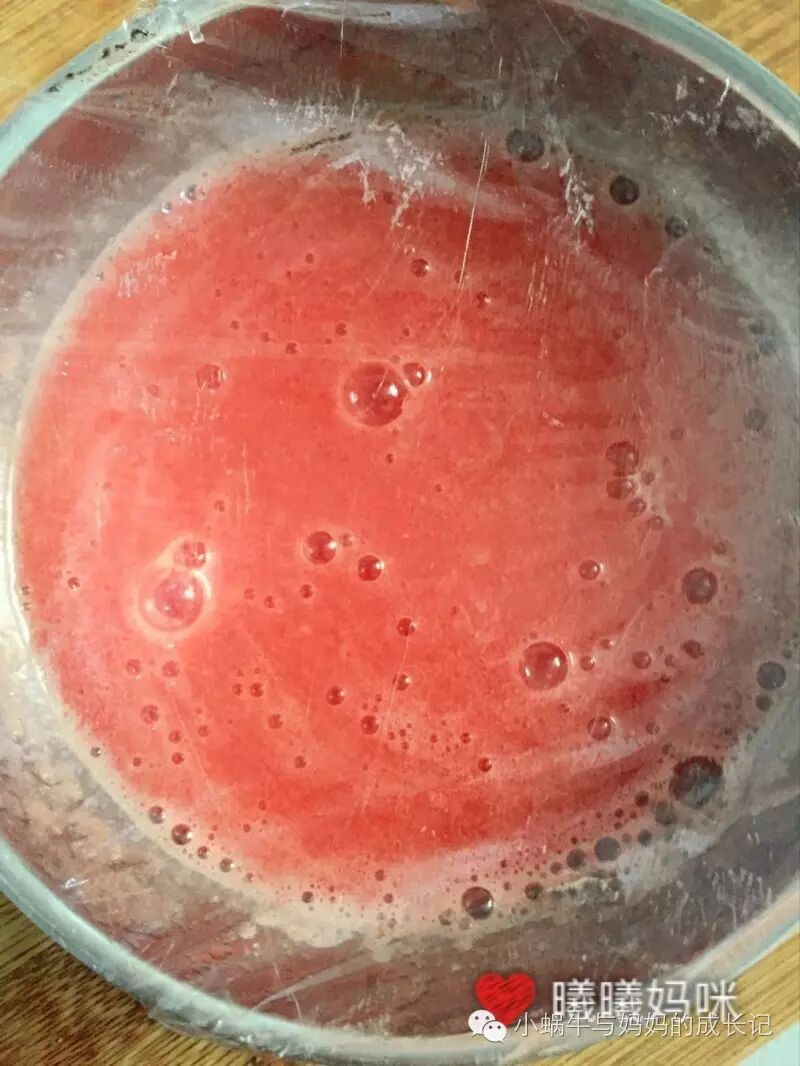第4步:打好的番茄汁倒碗中加入适量白糖搅拌均匀,盖保鲜膜放冰箱冷藏半天时间,腌渍出番茄的果糖。