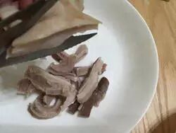 7.待猪肚不烫手时,用剪刀剪成长五公分,宽一公分的条状,这样嚼劲最恰当,非常好。