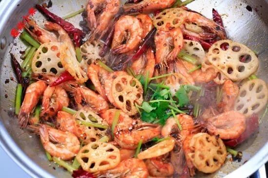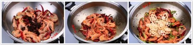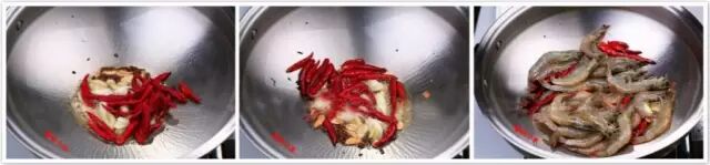 3.葱姜蒜炸透,下入红油辣酱、干辣椒,翻炒出香味烧至六七成热时,放入虾,盖盖炸约1分钟,煸至外焦里嫩。