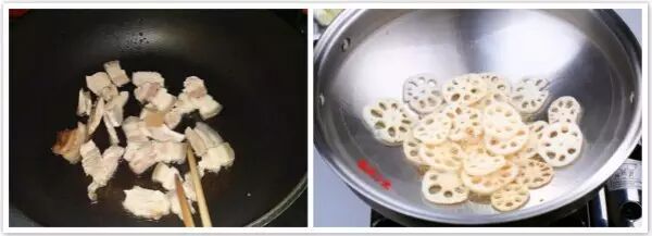 2.锅热后倒一点点油,放入五花肉,小火煸出油脂后捞出,放入藕片煸炒。