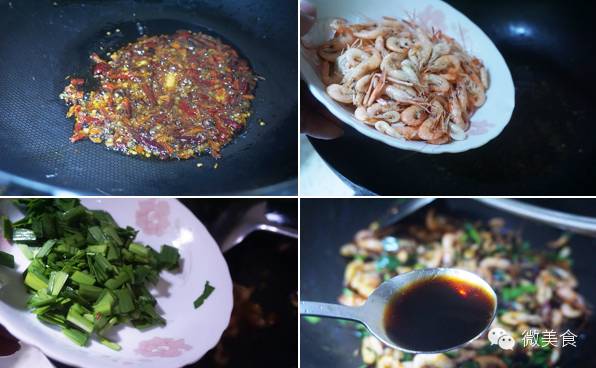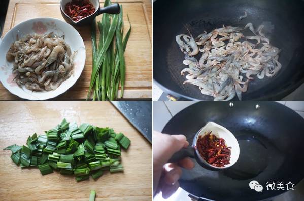 原料:小河虾200克,春韭50克,干红辣椒25克,花椒5克,油10毫升,盐少许,生抽5毫升