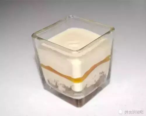 7.挤好芒果酱再倒一层慕斯料放冷藏冰箱▼