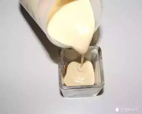 5.冷藏冰箱里的杯子拿出来,倒入一层慕斯料放入冰箱冻一下▼