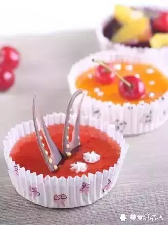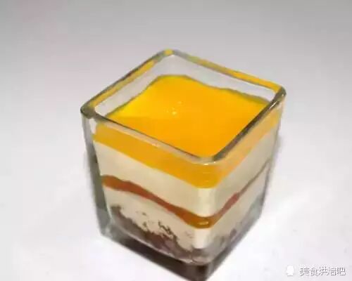 6.慕斯杯里的慕斯表面稍微冻上了拿出来挤一层芒果酱▼