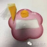 把卷好的芒果肠粉装盘。做玫瑰花:将切好的芒果薄片紧密的围在一起,小片的卷起来做花心,大片的一层层紧贴围圈,做好的玫瑰花放边上装饰,淋上少许糖浆,使花看起来有光泽些。把搅好的芒果浆装入裱花袋。