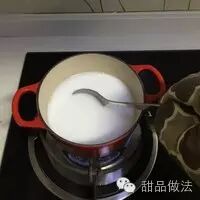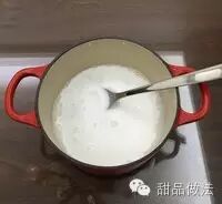 把300ml的冷水倒入小锅中,加入魔芋粉搅拌至无颗粒,然后再加入椰浆和糖拌匀。