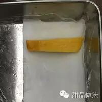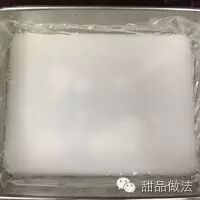 稍微放凉后,把椰浆魔芋糊倒入铺上保鲜纸的平盘中,摇至均匀,放入冰箱冷藏15分钟,直到凝固成为一块蒟蒻粉皮。