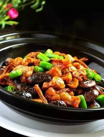 2、锅里放油烧热,先下几片猪五花肉煸香,其间加入蒜瓣、小葱头、煲仔酱,随后倒入岩豆、松茸和青杭椒节,另外加辣鲜露、美极鲜等调味,炒匀以后盛砂煲里便上桌。