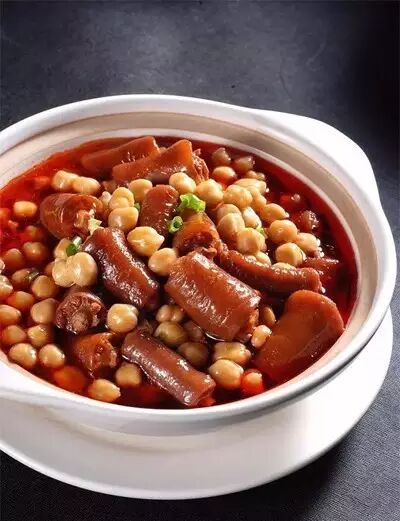 鹰嘴豆是产自新疆天山一带的豆类食材,把它与卤猪尾一同烧制,并且加了番茄酱调味,故成菜在家常风味的基础上又多了一丝酸香的滋味。