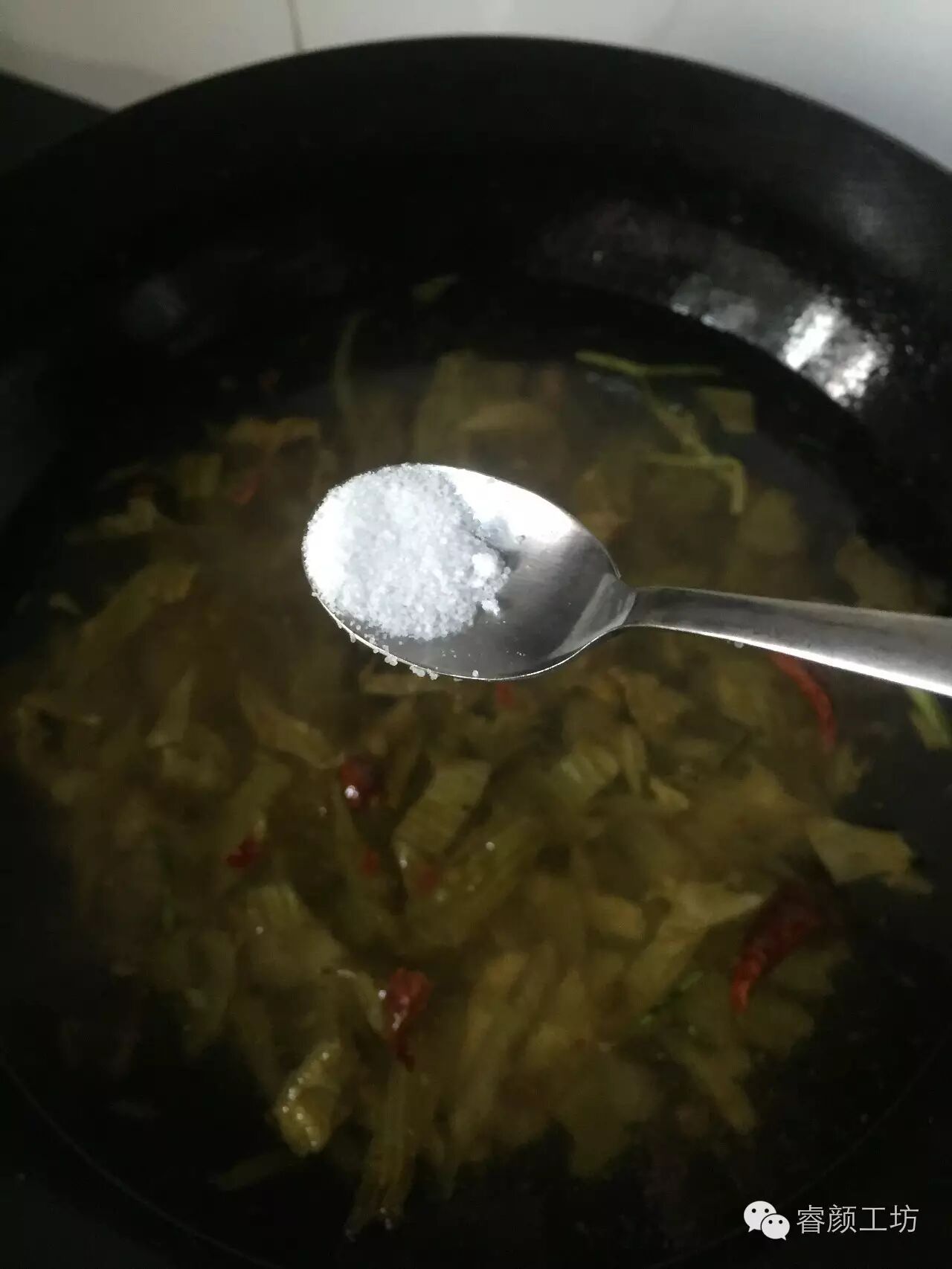 6. 放入干辣椒,适量糖和盐,