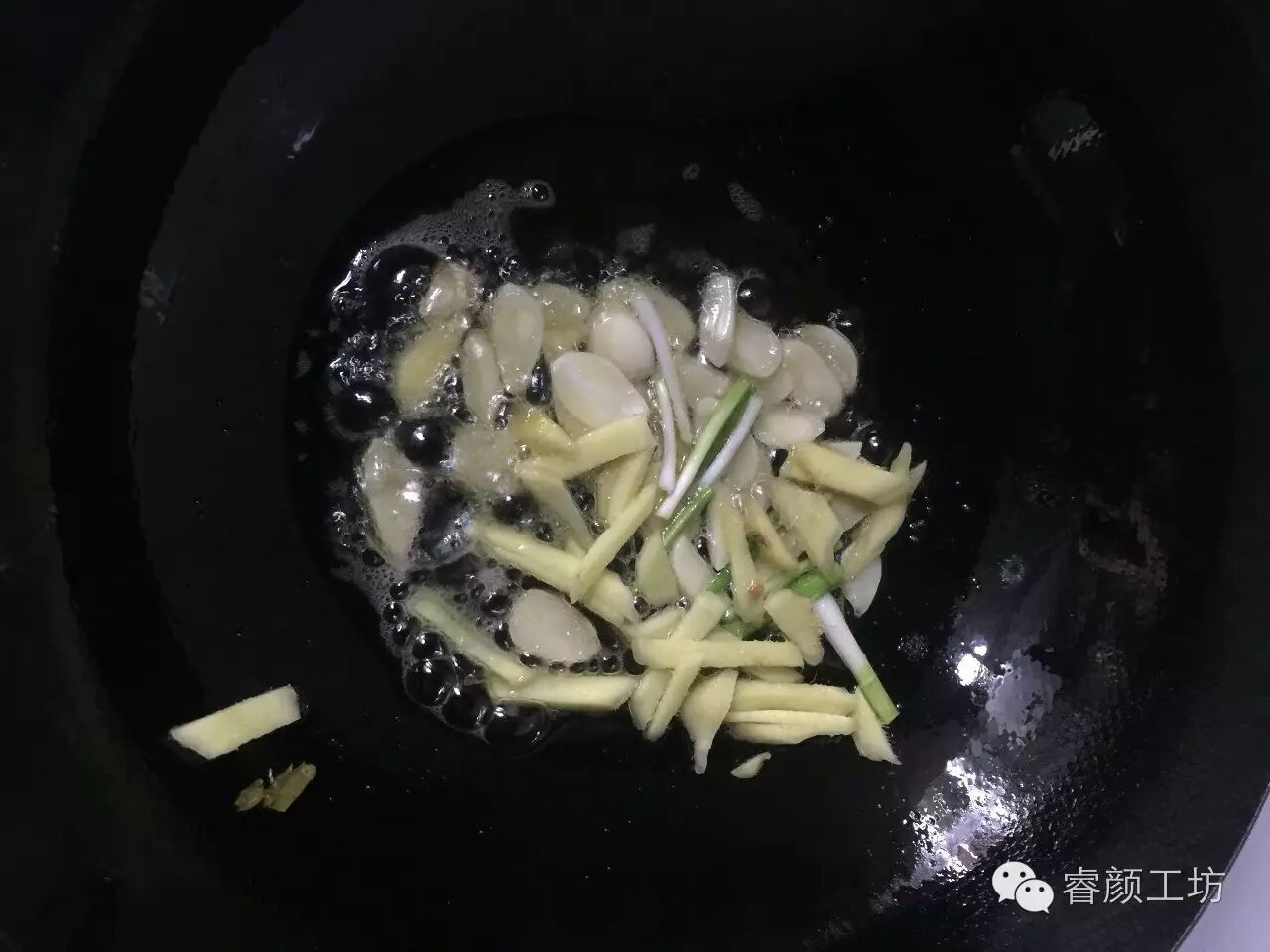 3. 热锅热油加入葱姜蒜爆香;