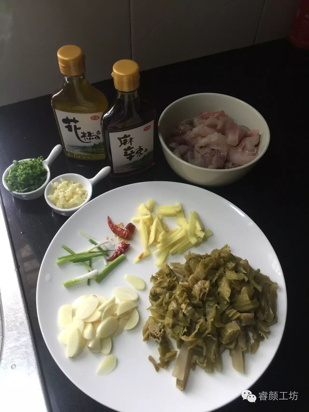 酸菜芯3棵,姜一块,蒜瓣若干,葱花适量。干辣椒2棵,黑鱼片1斤,仲景麻辣油,花椒油