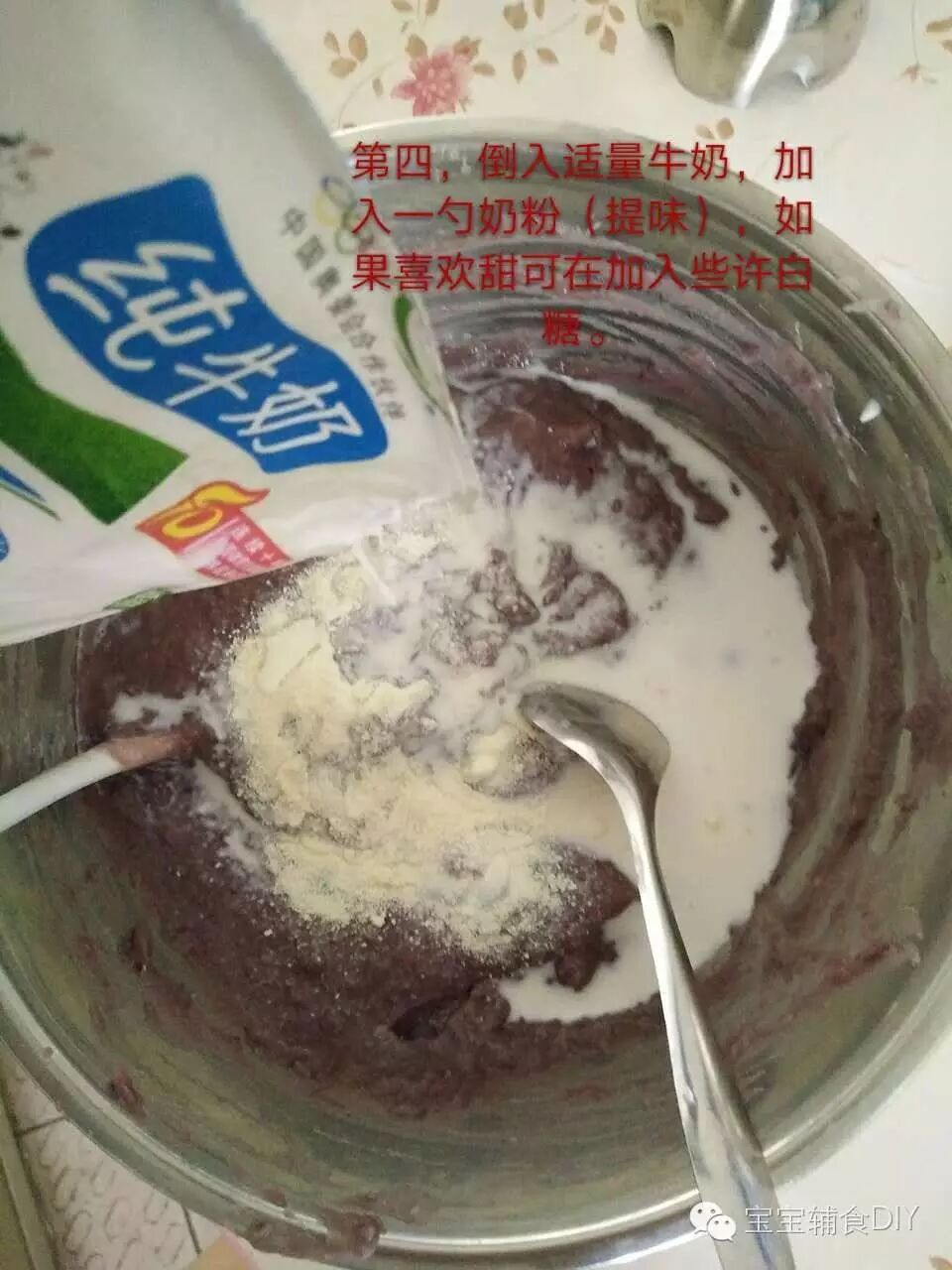 加入牛奶后,再用欧贝尔料理棒将其打至液体糊状,也可自行搅拌,料理棒搅拌的更加均匀,更快。