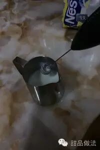 用拉花杯(或其他容器)倒入适量雀巢全脂无糖奶粉。加入少许热开水,用打奶泡器打出奶泡。