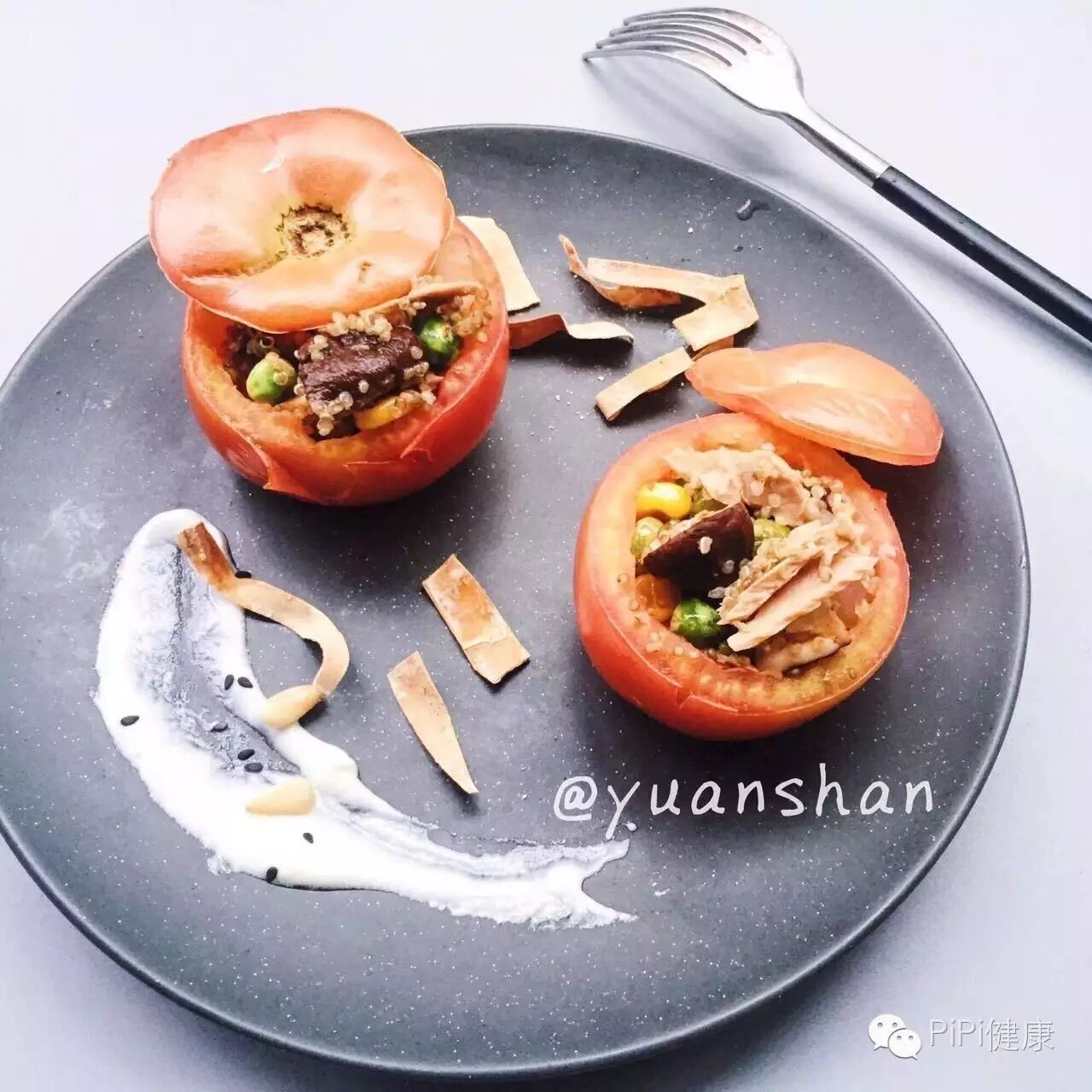 ⑤把炒好的藜麦装进空的番茄里
