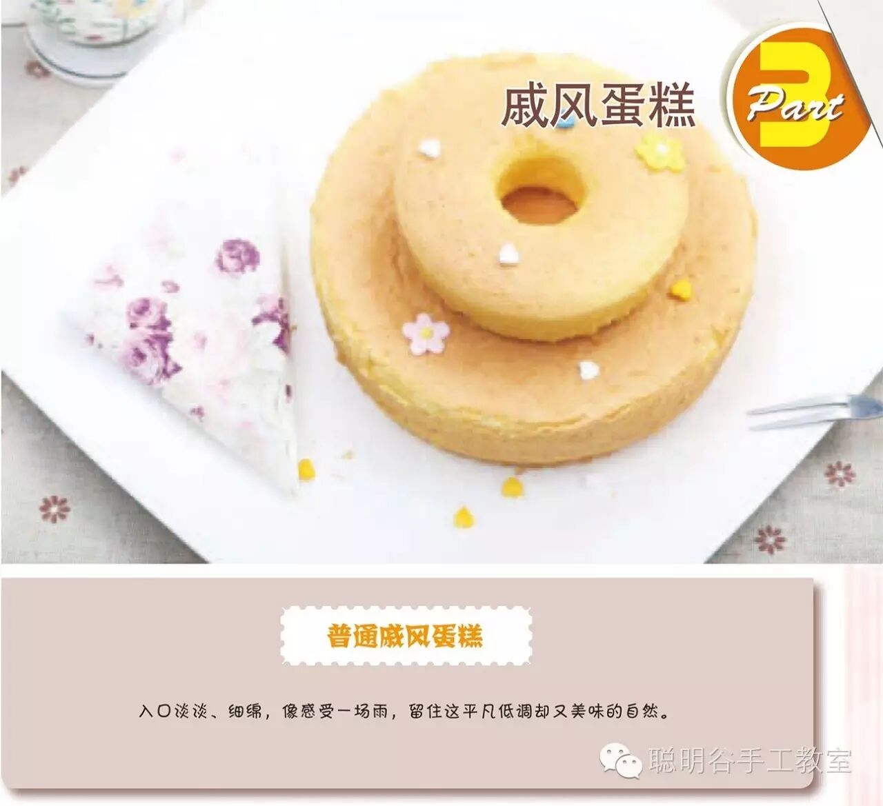 戚风蛋糕 [qī fēng] 是英文Chiffon Cake的音译,属海绵蛋糕类型,质地非常轻,用菜油、鸡蛋、糖、面粉、发粉为基本材料。由于菜油不像牛油(传统蛋糕都是用牛油的)那样容易打泡,因此需要靠把鸡蛋清打成泡沫状,来提供足够的空气以支撑蛋糕的体积。戚风蛋糕含足量的菜油和鸡蛋,因此质地非常的湿润,不像传统牛油蛋糕那样容易变硬。戚风蛋糕也含较少的饱和脂肪。但是由于缺乏牛油蛋糕的浓郁香味,戚风蛋糕通常需要味道浓郁的汁、或加上巧克力、水果等配料。