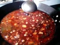 10.加骨头汤或鸡汤熬煮,这一步里面可放干辣椒段,放盐、鸡精、味精、葱头、姜片,熬好汤后即可起锅煮火锅了。