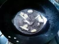 5.起油锅,烧好油后关火,凉油下姜片、葱头爆香。