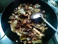 8.油锅内先倒入炼熟的辣椒,再倒入腌好的中草药,小火慢炒,这个过程中可以加入剩下的白酒,米酒。