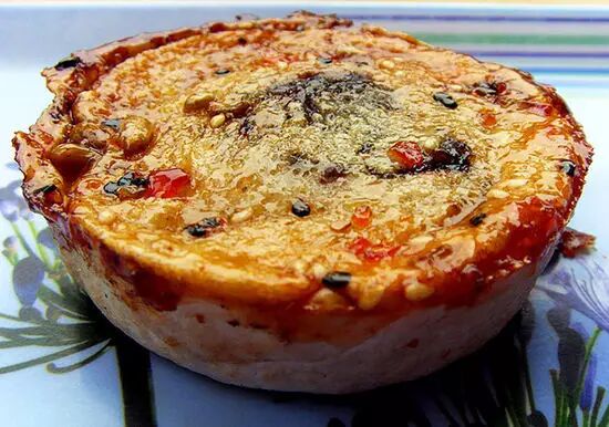 海棠糕算是点心中的老一辈,很多年轻人对它都是百闻无一见。在“老字号”松月楼,这道点心却依然畅销。师傅们 都是上了年纪的,在模子里先放了面皮,然后依次加上豆沙、瓜子、糖、油,表面撒上饴糖和芝麻,烘烤得微微发红,海棠糕的表面有彩色的糖丝、黑色的芝麻、淡 黄的瓜仁,色彩缤纷,煞是好看,吃到嘴里,芬芳四溢。