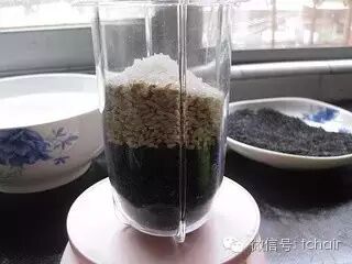 黑芝麻炒香打成粉,核桃烤香掰成黄豆大小