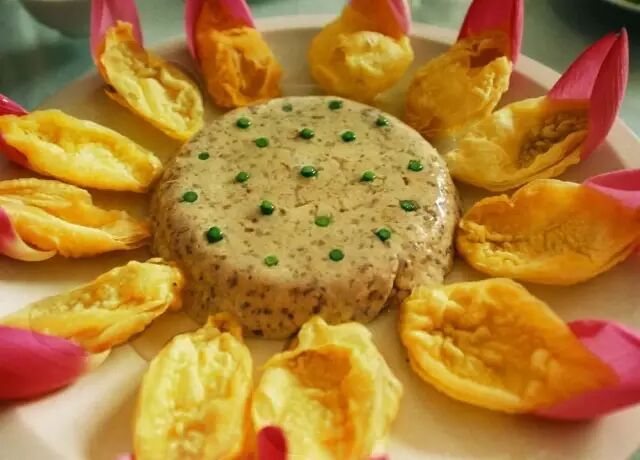 不得不提这其中令人耳目一新的两道菜:茶叶太极羹和茶叶熏火腿。用豆腐做成羹,其实很普通,但用茶叶做成太极图案之后就一下子吸引了眼球。白色和绿色相间而成,入口温润清爽,很适合在这炎炎夏日品的一道美食。