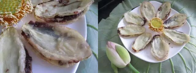 讲究一些,把豆沙抹在中间,顺长叠起来。待油五成热时,把豆沙花瓣蘸上蛋清糊下锅,然后装盘撒上糖桂花就可上桌了。此菜外酥内软,甘美异常,荷花的芬芳令人齿颊生香。