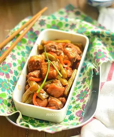 9、放入红椒,调入白糖,开大火一边翻炒一边收汁待汁,收到浓稠即可