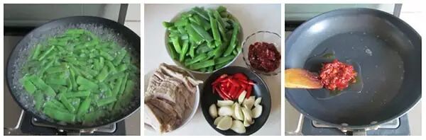 五花肉300克、四季豆300克、大蒜适量、姜片适量、郫县豆瓣酱适量、花椒适量、料酒适量、红辣椒适量、糖适量、油盐适量