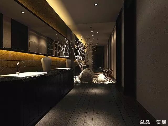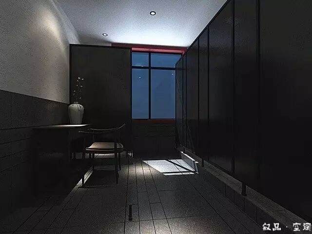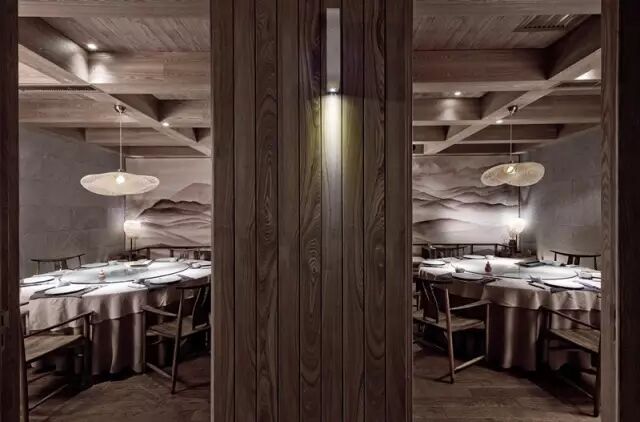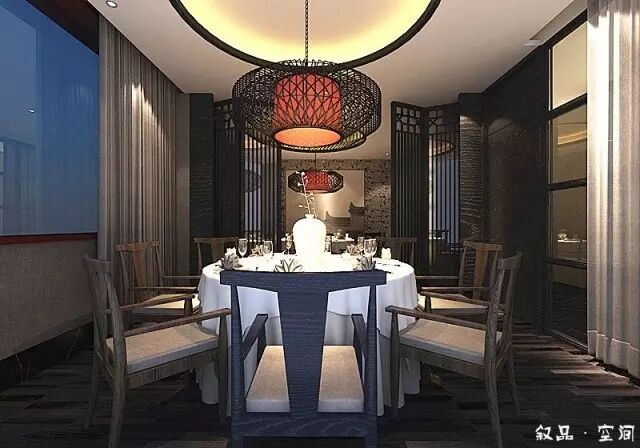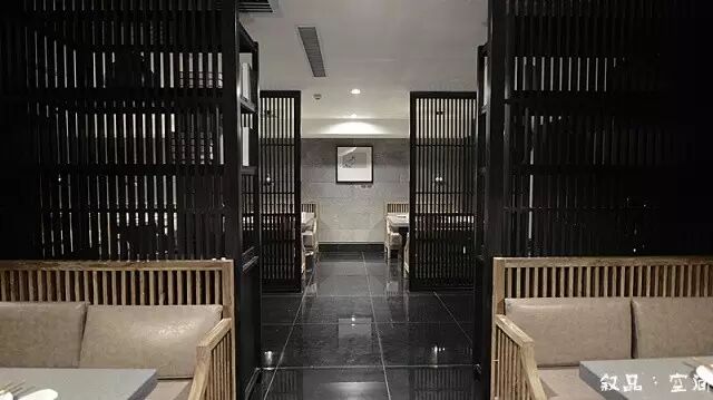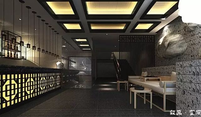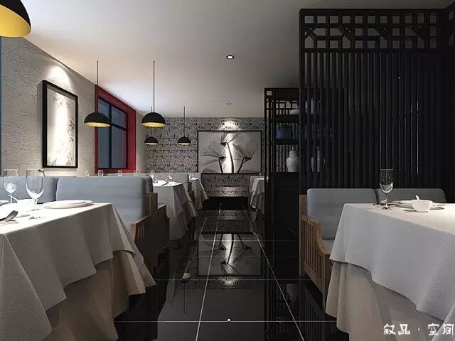 进入接待厅,古典木质花格的吧台散发着淡淡的灯光,黑白根大理石的台面和顶面黑色的小吊灯把接待区和收银区很好地隔开。鸟笼灯作为一种辅助光源,增加了空间的柔和度。黑色方管和实木层板组合的层板架摆放着一些装置品,在鸟笼灯的衬托下,又形成了一个独特的造型。吧台的对面是等待区,沙发背后规划了一处水景。俗话说:“遇水则发,活水聚财”,象征了生意的蒸蒸日上,然而滴滴答答的水流声回荡着整个空间,使客人一踏进餐厅,便有一种轻松自在的心情。