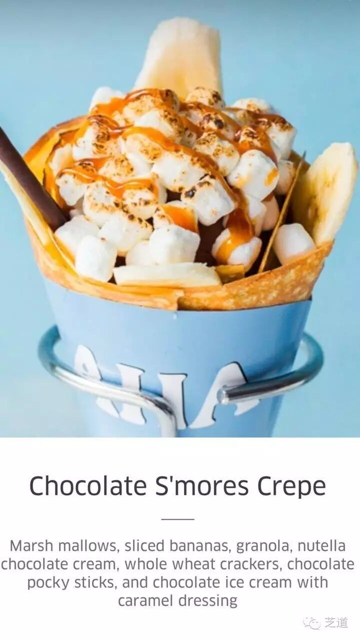 Aha Crepe出生于日本颇为流行的小吃--鸡蛋卷(煎)饼世家,继承了日式薄饼的优点,店主在引入芝加哥时融入了美式口味的改良。由过去传统的卷饼内填充香蕉,蜂蜜和榛子巧克力酱这些略显单一的馅料上,增加了年轻人喜爱的日式抹茶(Matcha)、香草冰等甜品口味馅料,还创意性的增加了三文鱼等咸品口味的馅料。多种营养蔬菜和相当丰盛的馅料,使得这款“美日混血”的卷饼让食客们从中尽情享受和品尝它独特的原汁美味。
