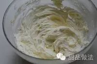 分3—5次加入全部的淡奶油,用电动打蛋器打发。这是打发好的黄油,能看到明显发白,体积增大,呈现很好的乳霜状,也就是所谓的羽毛状。这一步的状态非常重要。完成好了,基本就意味着成功了一大半。