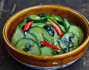 3. 锅里放油,入辣椒和蒜蓉爆香。然后倒入黄瓜,翻炒几下,加紫苏和以上酱汁,用中小火翻炒均匀,酱汁与黄瓜充分混合即可。