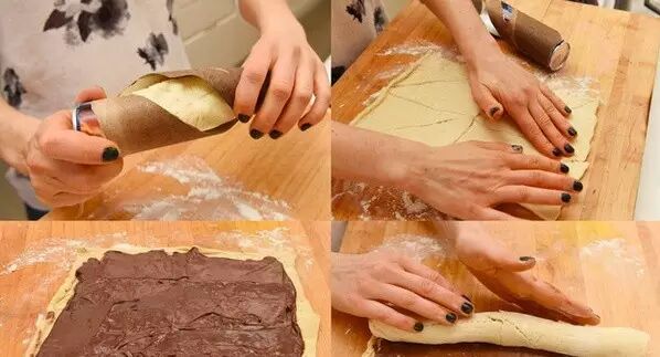 3.涂好后,将面团沿一侧卷起成卷儿状。