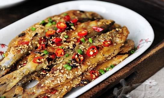 食材:小河鱼、熟芝麻、辣椒、面粉、葱、花生油、姜