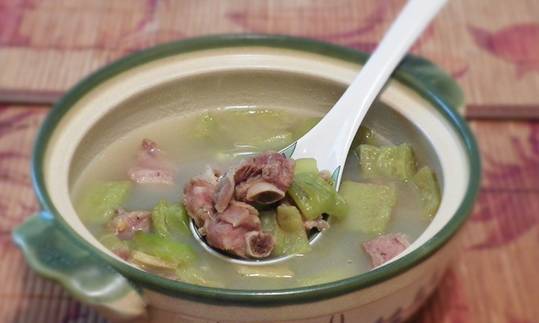 6.排骨煮至较软时,倒入苦瓜,撒一点点胡椒粉(去腥味),盖盖子,慢火煮,煮至苦瓜和排骨酥软,大约20-40分钟,食用时才加盐。