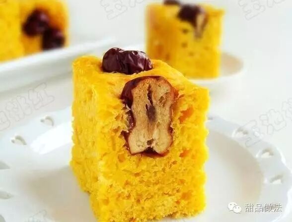 甜品做法·南瓜红枣发糕|早餐做法简单易学,食材也很简单哦!只用南瓜泥做的发糕,金灿灿的,卖相极佳,口感香甜松软,再加上大红枣,使发糕多了红枣的香甜味道,更加的好吃,快来试试吧。