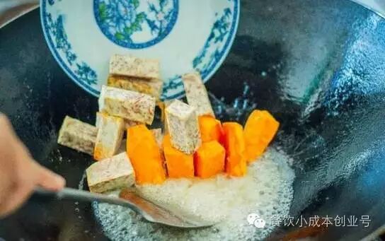 锅中不能有水,倒入油,小火,火候不宜过大。油温30°时将芋头倒入锅中进行煎炸。