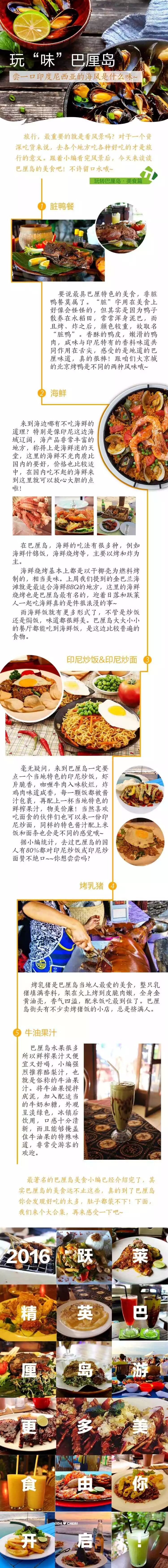在巴厘岛,不仅有海风和落日,不仅有宗教与寺庙。对于“民以食为天”的国人来说,美食总是那么的吸引着我们的目光。在印尼、在巴厘岛,也有一些各式各样不同风味的美食大餐,印尼炒饭、烤乳猪等等,光是听名字,都足以让我们垂涎三尺,今天,就跟着小编一起,去“尝尝”舌尖上的巴厘岛吧!