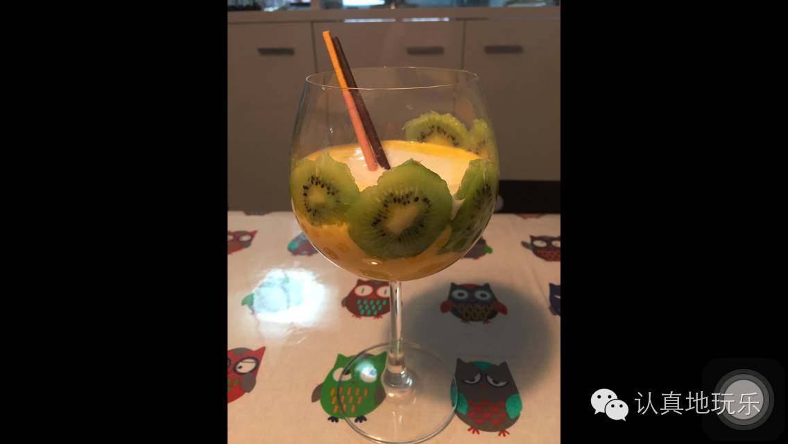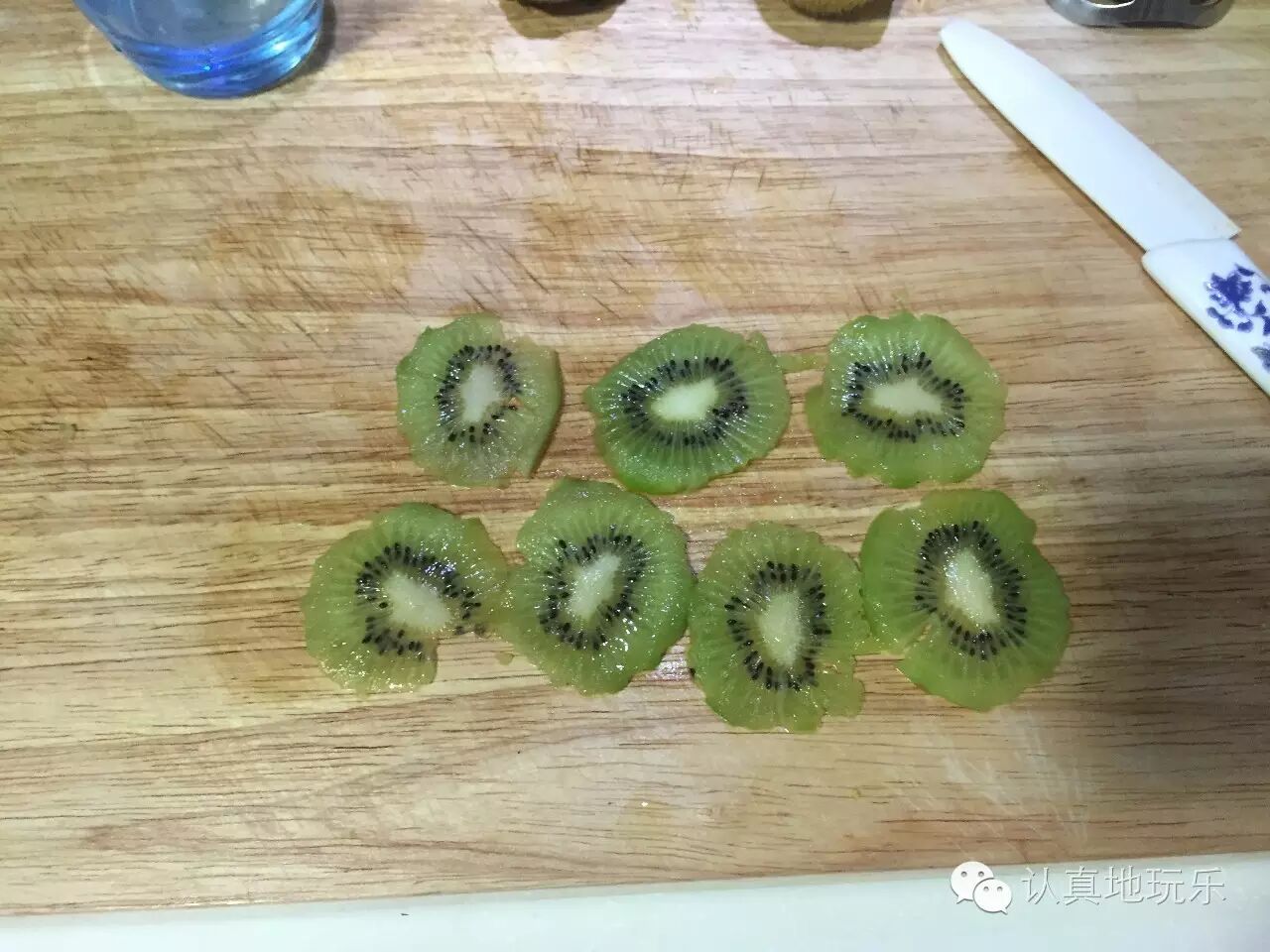 猕猴桃切成薄片,贴在杯子上面,造型自己设计。