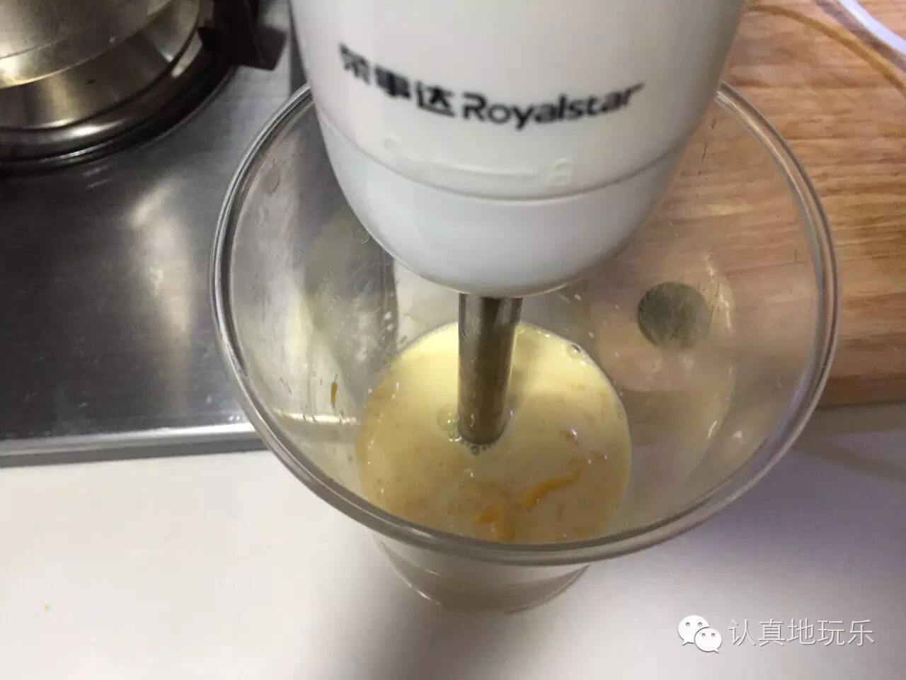 芒果切成小块加入牛奶用搅拌棒打成果泥。