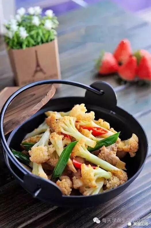 5、将肉推至一边,开大火,倒入菜花,略停30秒再翻炒几下。