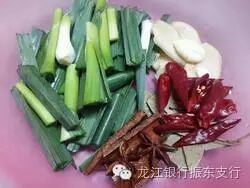 2.八角、桂皮、香叶洗净,辣椒干、蒜瓣、蒜苗、生姜切好备用;