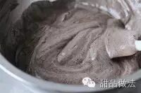 8、用刮刀翻拌到看不见干粉为止,因为黑可可粉容易导致蛋糊消泡,所以拌的动作要轻一些且翻拌不要过度,只要看见没有干粉就好。