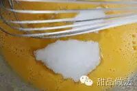 3、鸡蛋在搅拌盆内打散后加入细砂糖。