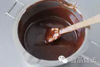 16、等蛋糕散热的时候做巧克力内馅,把巧克力和淡奶油A倒入小锅内,小火加热,慢慢地搅拌直到巧克力充分融化整体搅拌均匀后离火搁在一旁散热。(如果是盛夏巧克力散温会比较慢可以盖上保鲜膜放进冰箱里。)