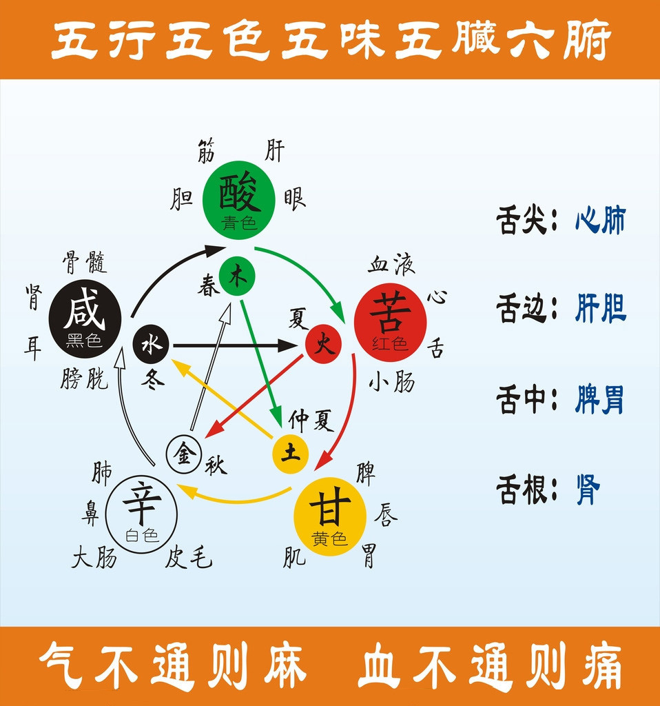 五行:金、水、木、火、土、五脏:肺、肾、肝、心、脾、五色:白、黑、绿、红、黄互为表里,有不可分割的关系。当每天全身五脏、六腑在辛勤的工作、疲累之后都能各自得到充份的养份补给,身体就不容易生病。相反的,若长期偏食,五脏、六腑每天辛勤的工作、疲累之后,某器官长期得不到养份的补给,就会产生疾病。