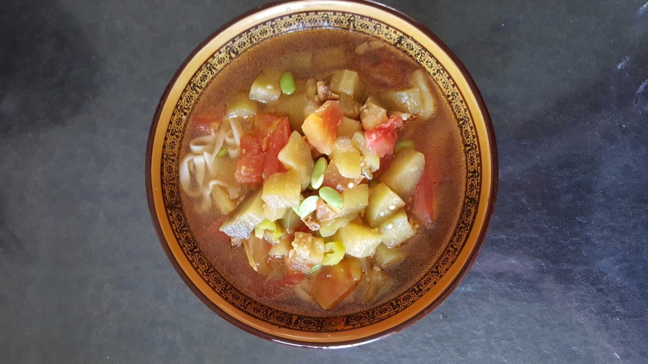把茄丁卤倒进面条碗里就可以吃了。