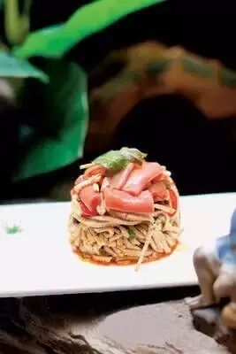 口味突出,而且造型有特点,是少有的能让海鲜站起来的菜肴。在将五香豆腐丝、海肠作为主料的同时,添加香椿苗作为配料,其清香的味道可以使前两种主料的味道更圆润。